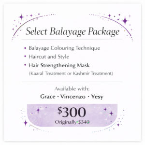In this package you will receive: * Balayage Colouring Technique * Hair strengthening mask * Haircut & Style * Available with Grace, Vincenzo or Yesy